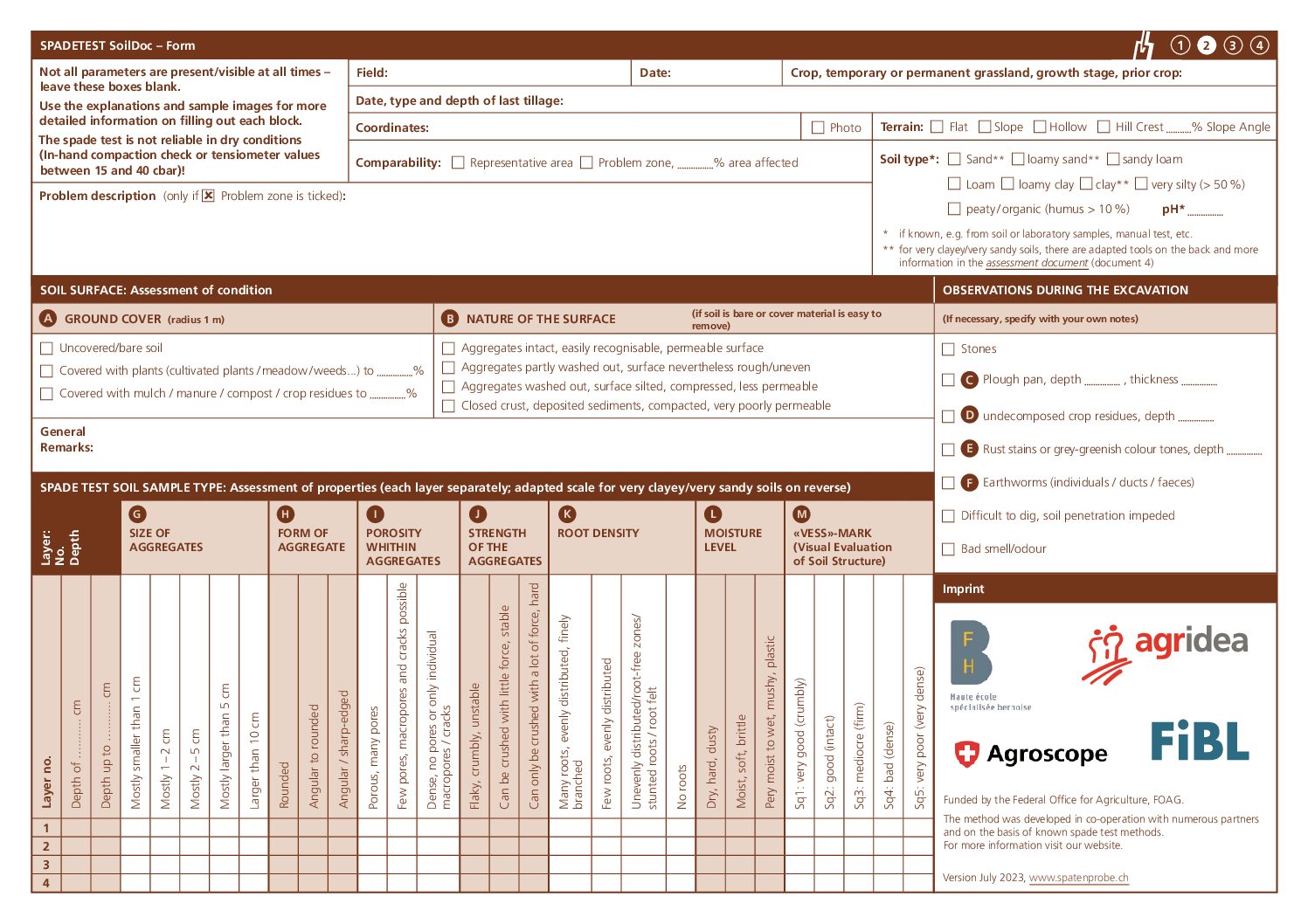 In questo caso, la struttura naturale del suolo appare diversa da quella dei suoli con una tessitura nella media. I suoli argillosi appaiono più densi, quelli sabbiosi meno stabili. In linea di massima, il test della vanga può essere eseguit allo stesso modo, tenendo conto di queste particolarità. Maggiori informazioni si trovano nel documento documento per la valutazione delle osservazioni (documento 4). Per osservazioni su più anni, confronti tra parcelle o altri casi in cui si desidera conservare le osservazioni, è opportuno utilizzare le tabelle adattate sul retro del modulo (documento 2).